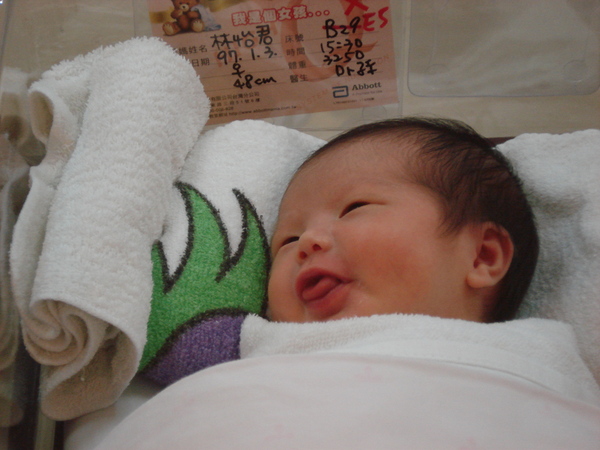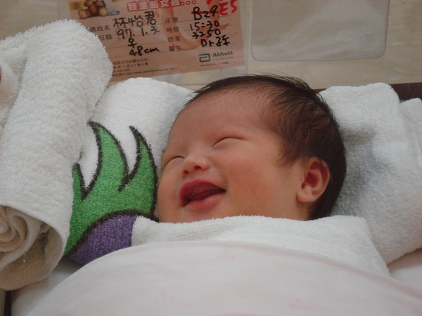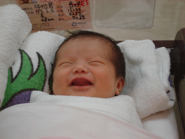 由於現在只有老婆能直接接觸到baby,因此許多小寶寶的動作及表情都是老婆餵哺母乳時發現的,真羨慕!前幾天告訴我說,寶寶有笑唷~ 哇!寶寶在微笑應該很可愛吧;也許心有靈犀,前天隔著玻璃看寶寶時,她笑了...而且是睡夢中的微笑,也許是sweet dream,趕緊利用連拍模式,終於捕捉到夢寐以求的smile! 專家說過:小baby的笑容是世上最真誠的,旁人看見,都會被感染.